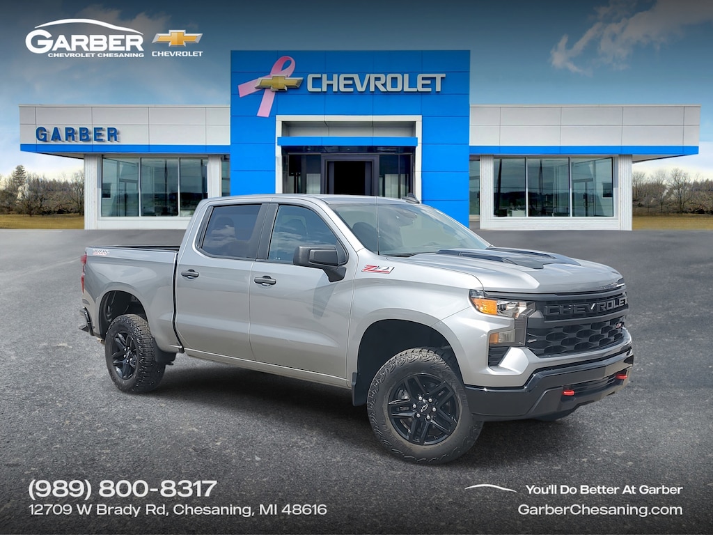 Sterling Gray Metallic 2023 Chevrolet Silverado 1500 Custom Trail Boss 4WD **Apple car play, Android auto, **Back up camera, **Remote start, **Spray in bedliner, 4D Crew Cab, 2.7L Turbo, 8-Speed Automatic, Cloth Rear Seat w/Storage Package, Custom Convenience Package, Preferred Equipment Group 2CX, Suspension Package, Trailering Package. CARFAX One-Owner. Clean CARFAX.** Come see why so many people make the short drive to Garber in Chesaning for their next vehicle! P.S. We offer home delivery AND 24 hour at home test drives!Priced below KBB Fair Purchase Price! Odometer is 8264 miles below market average!